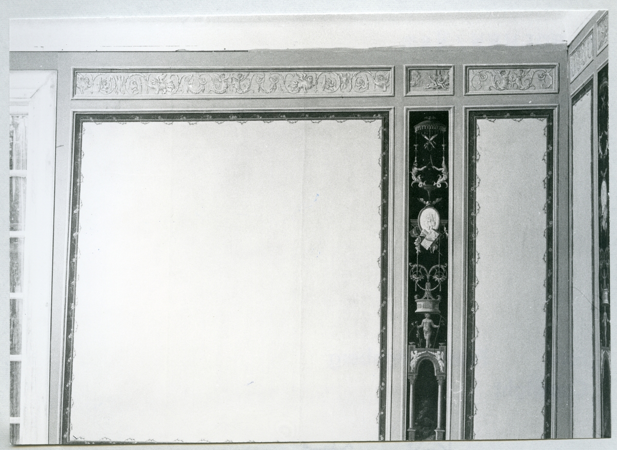 Interiör. Väggfält med bemålade, ditspikade vävtapeter, efter konservering. 1973.