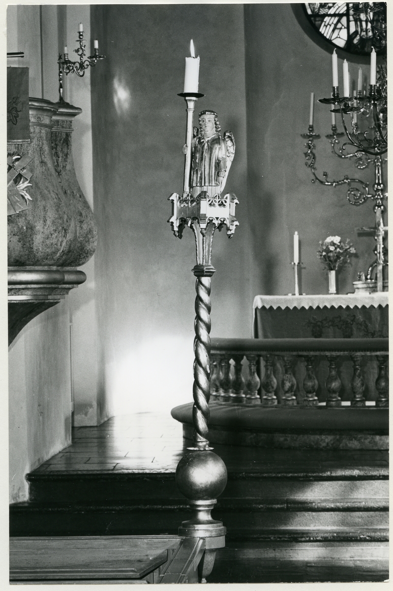 Interiör av Skultuna kyrka, 1980. Ljusstavsängel.