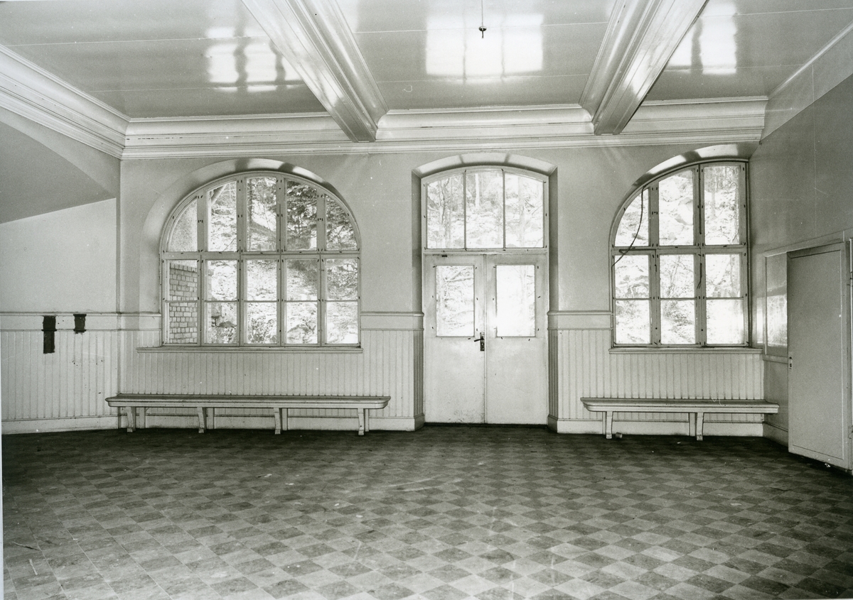 Snytens järnvägsstation, interiör med fönster, dörr, bänkar, rutigt golv, 1971.