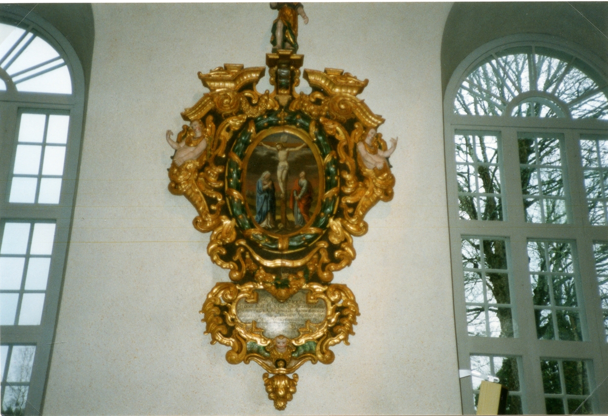 Interiör Karbenning kyrka med epitafium och kyrkfönster, 2000.