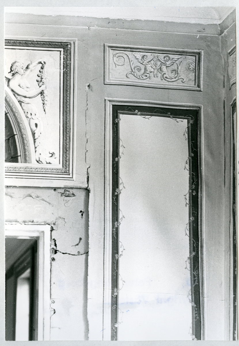 Interiör. Väggfält med bemålade, ditspikade vävtapeter, före konservering. 1973.