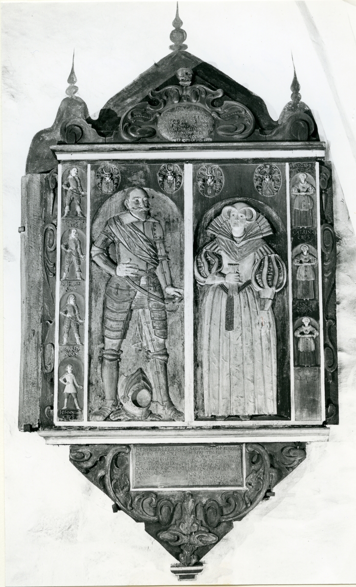 Epitafium över herren till Frösåker, Jesper Nilsson och hans första hustru, början av 1600-talet, i Kärrbo kyrka. 1980.