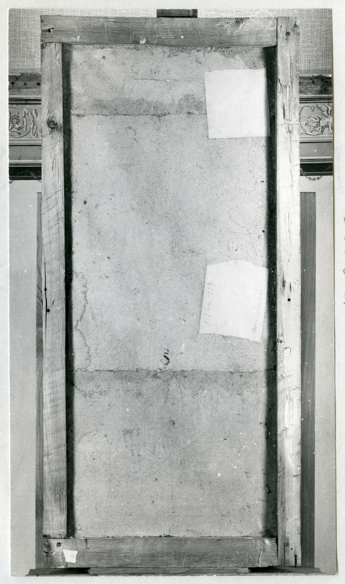 Interiör. Väggfält med bemålade, ditspikade vävtapeter, under konservering. 1973.