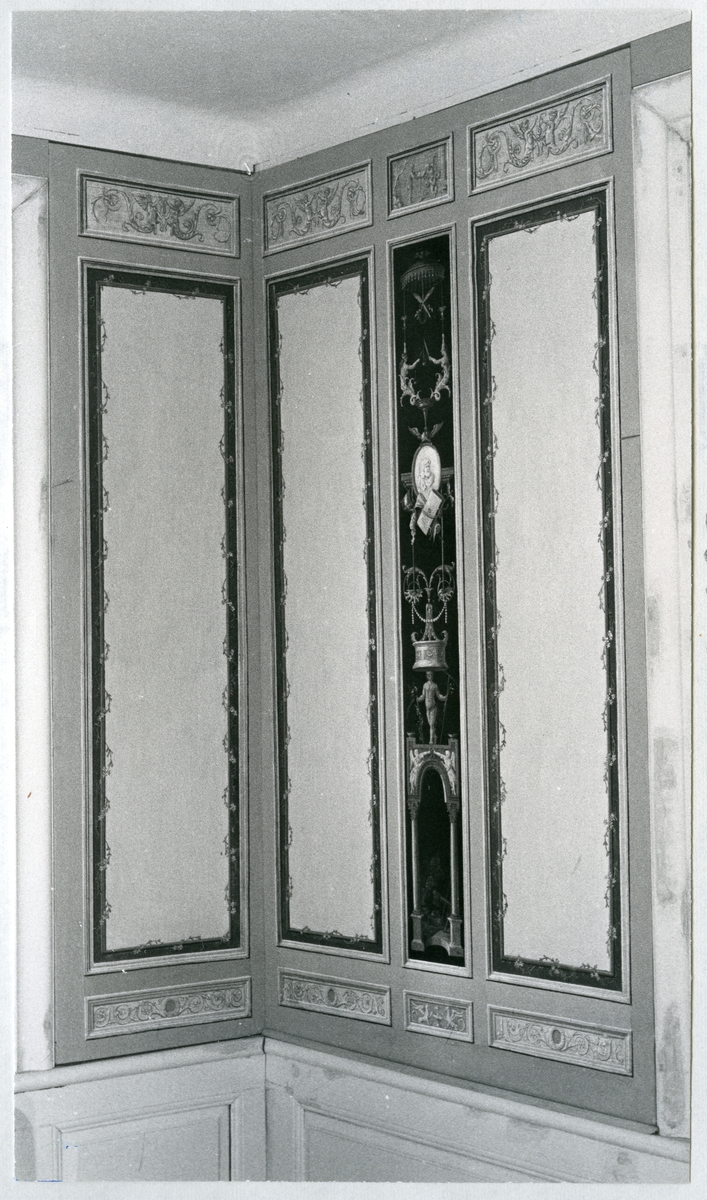 Interiör. Väggfält med bemålade, ditspikade vävtapeter, efter konservering. 1973.