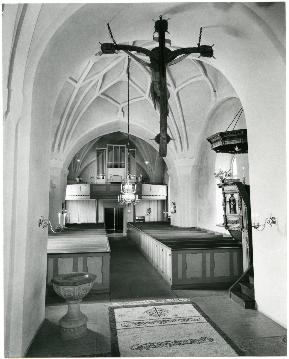 Interiör mot kyrkorgeln med dopfunt, bänkar m.m., 1983.