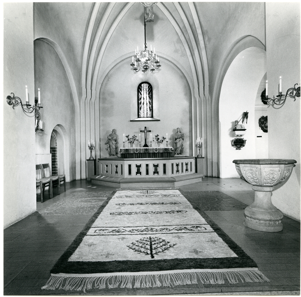 Interiör med altaret, dopfunt, matta m.m., 1983.