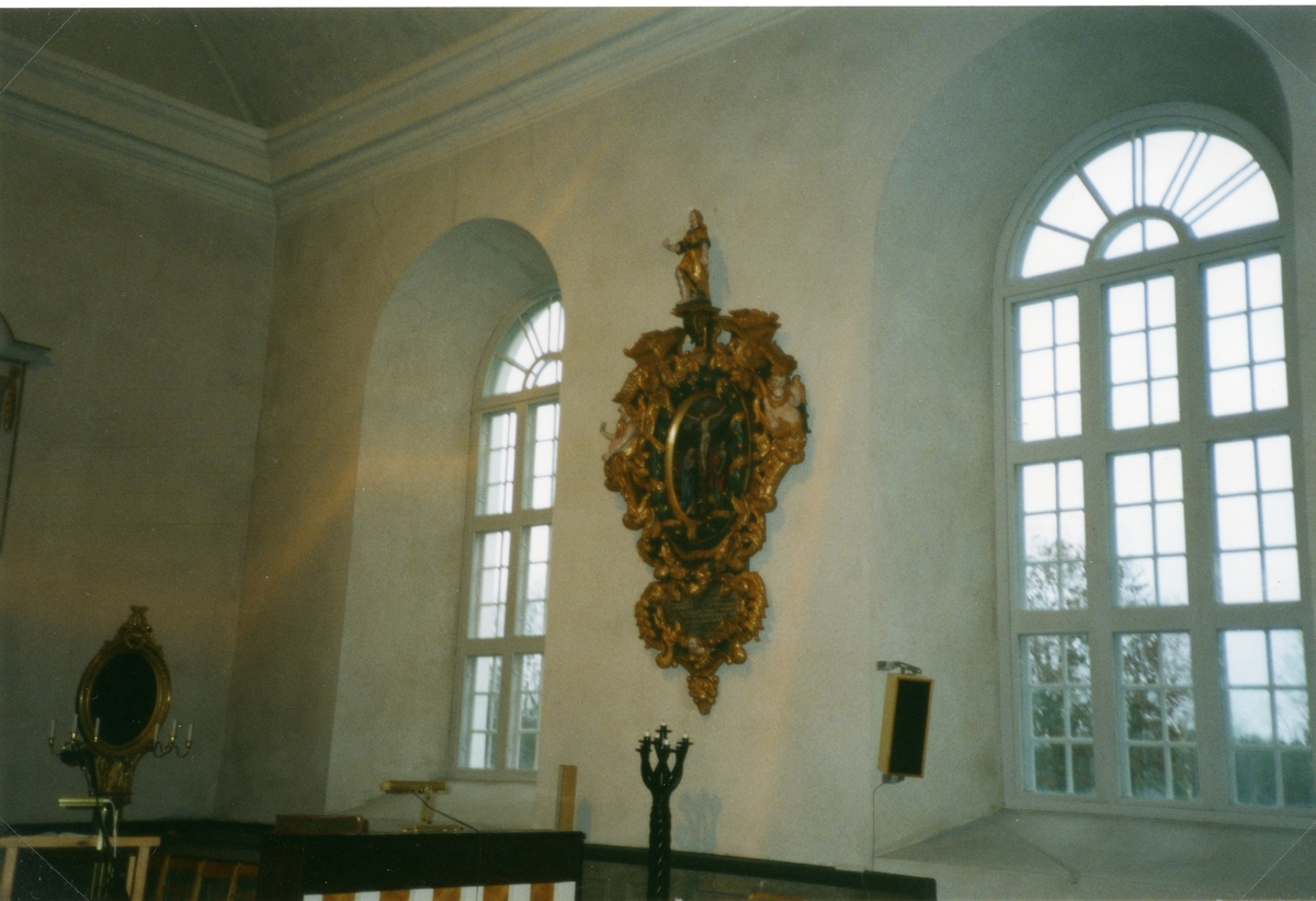 Interiör Karbenning kyrka med epitafium och kyrkfönster, 2000.