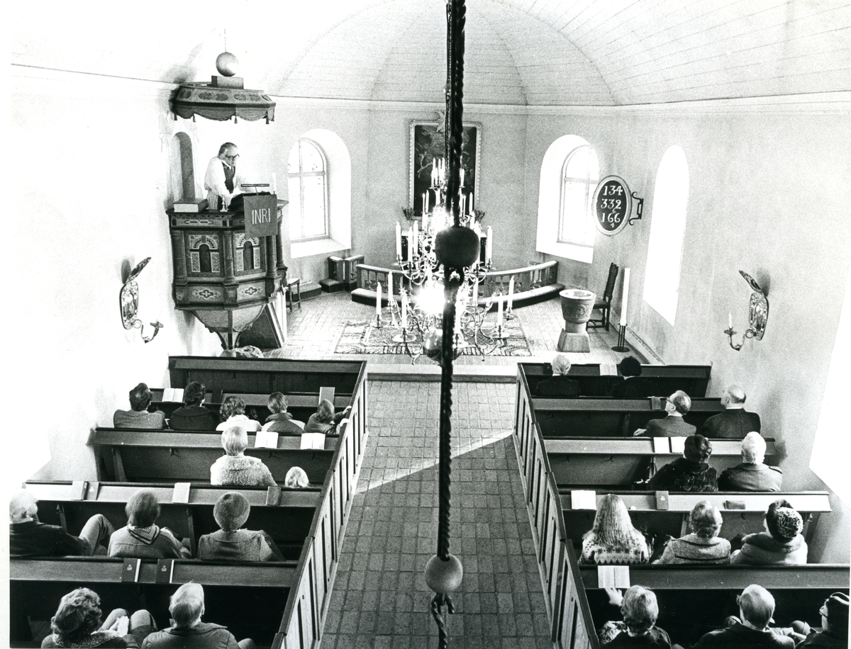 Prästen håller predikan från predikstolen i Lillhärads kyrka.