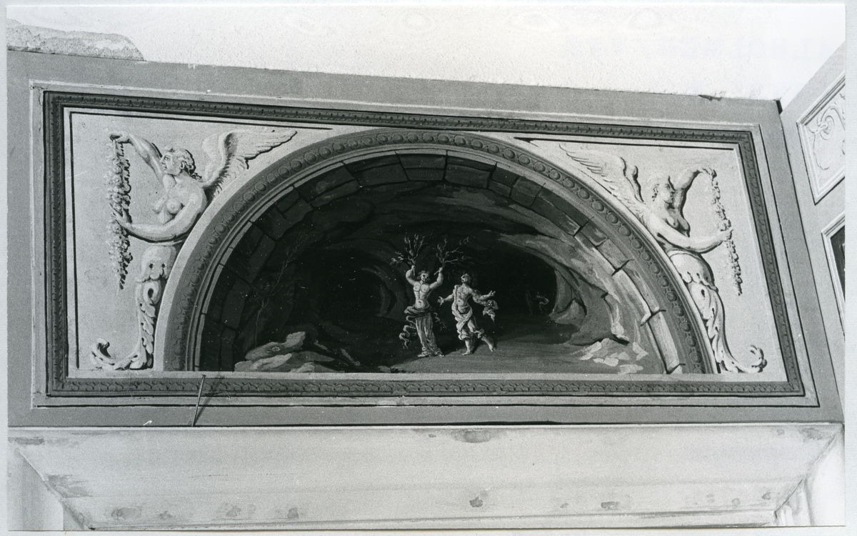 Interiör. Väggfält med bemålade, ditspikade vävtapeter, efter konservering. 1973.