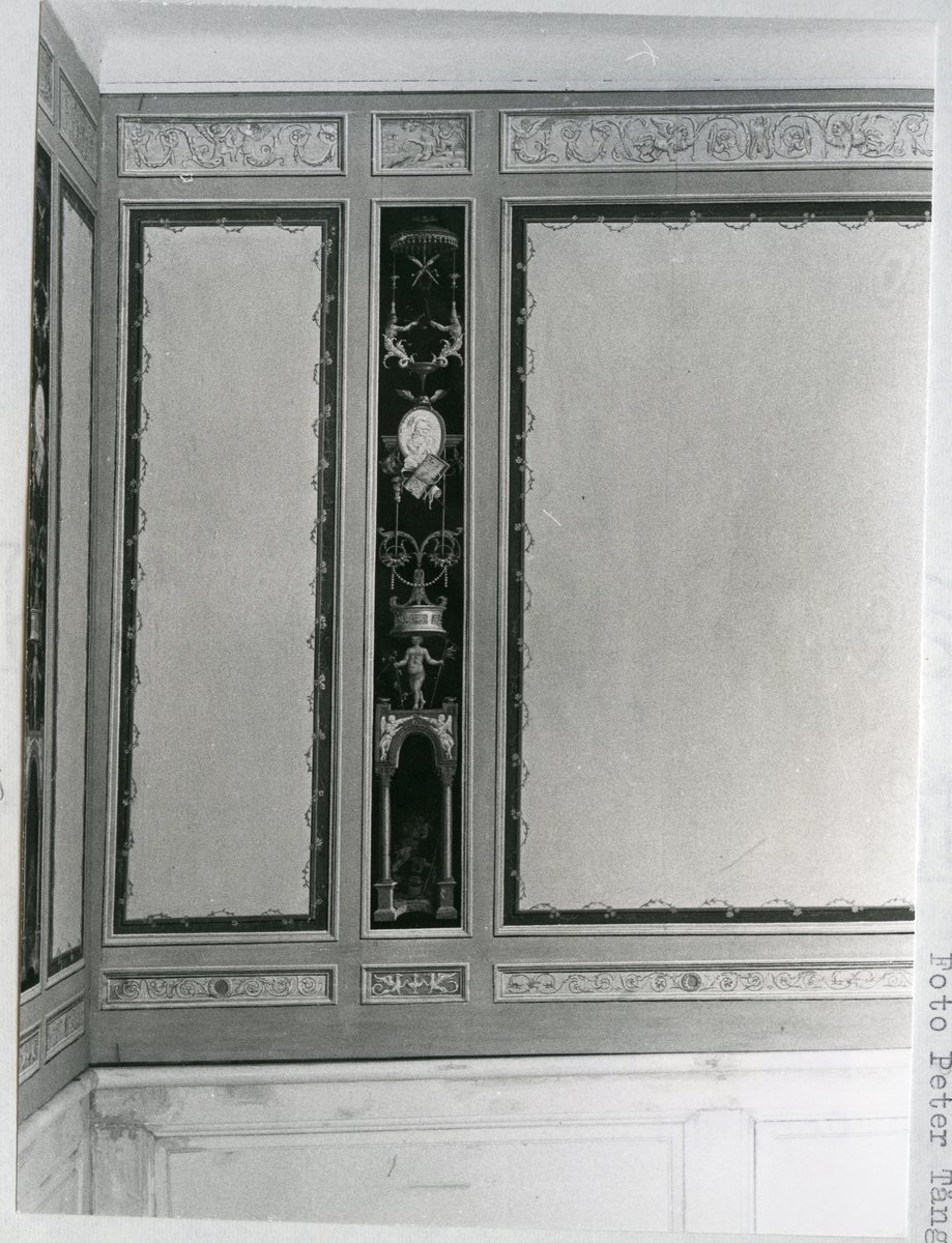 Interiör. Väggfält med bemålade, ditspikade vävtapeter, efter konservering. 1973.