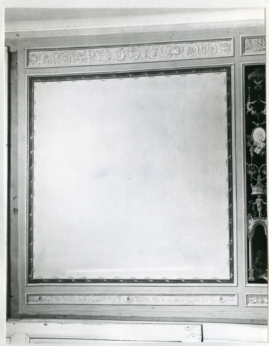 Interiör. Väggfält med bemålade, ditspikade vävtapeter, före konservering. 1973.