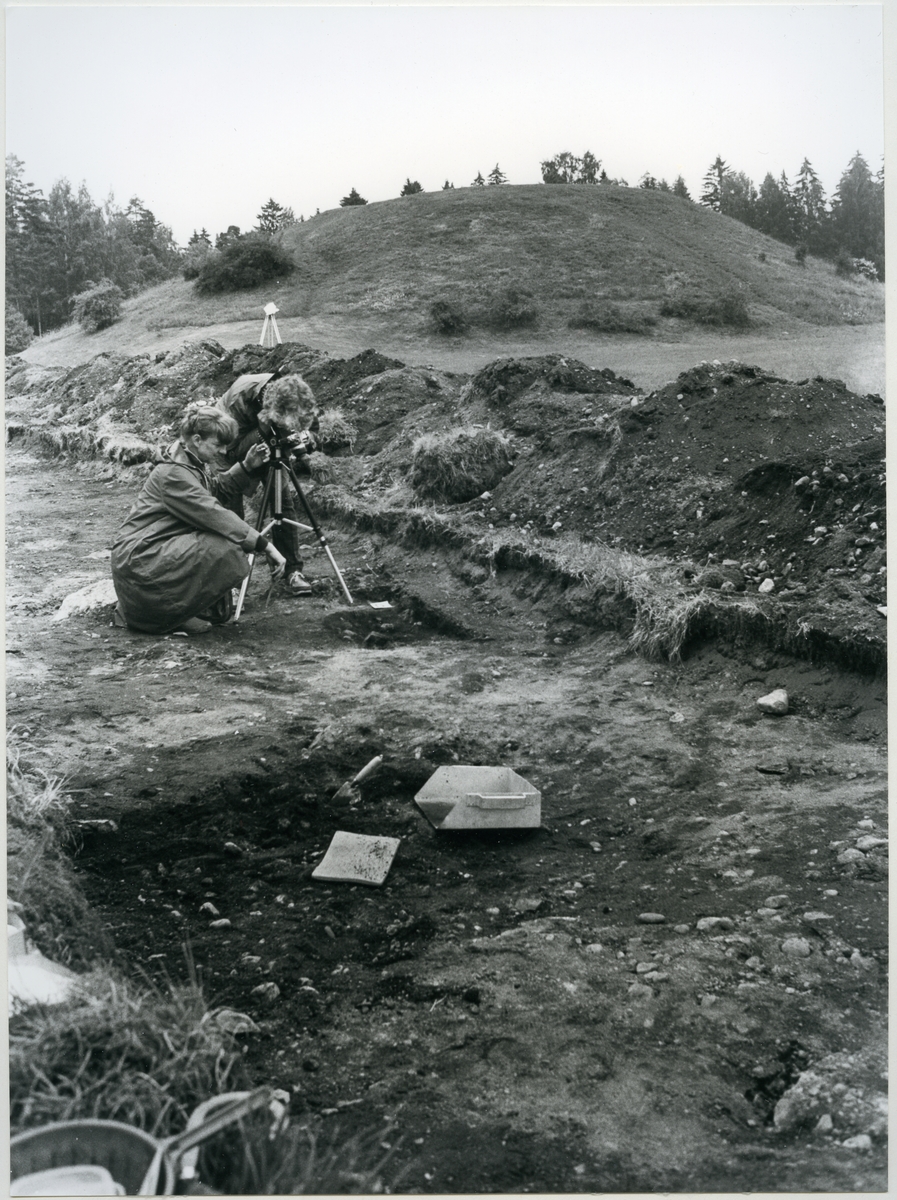 Eva Lindahl och Eva Simonsson vid pågående undersökning för anläggande av cykelväg 1984.