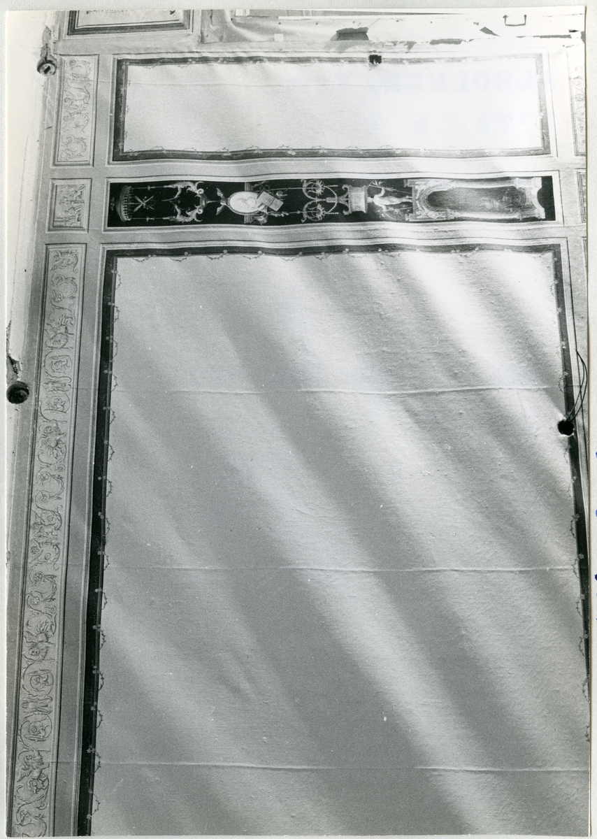 Interiör. Väggfält med bemålade, ditspikade vävtapeter, före konservering. 1973.