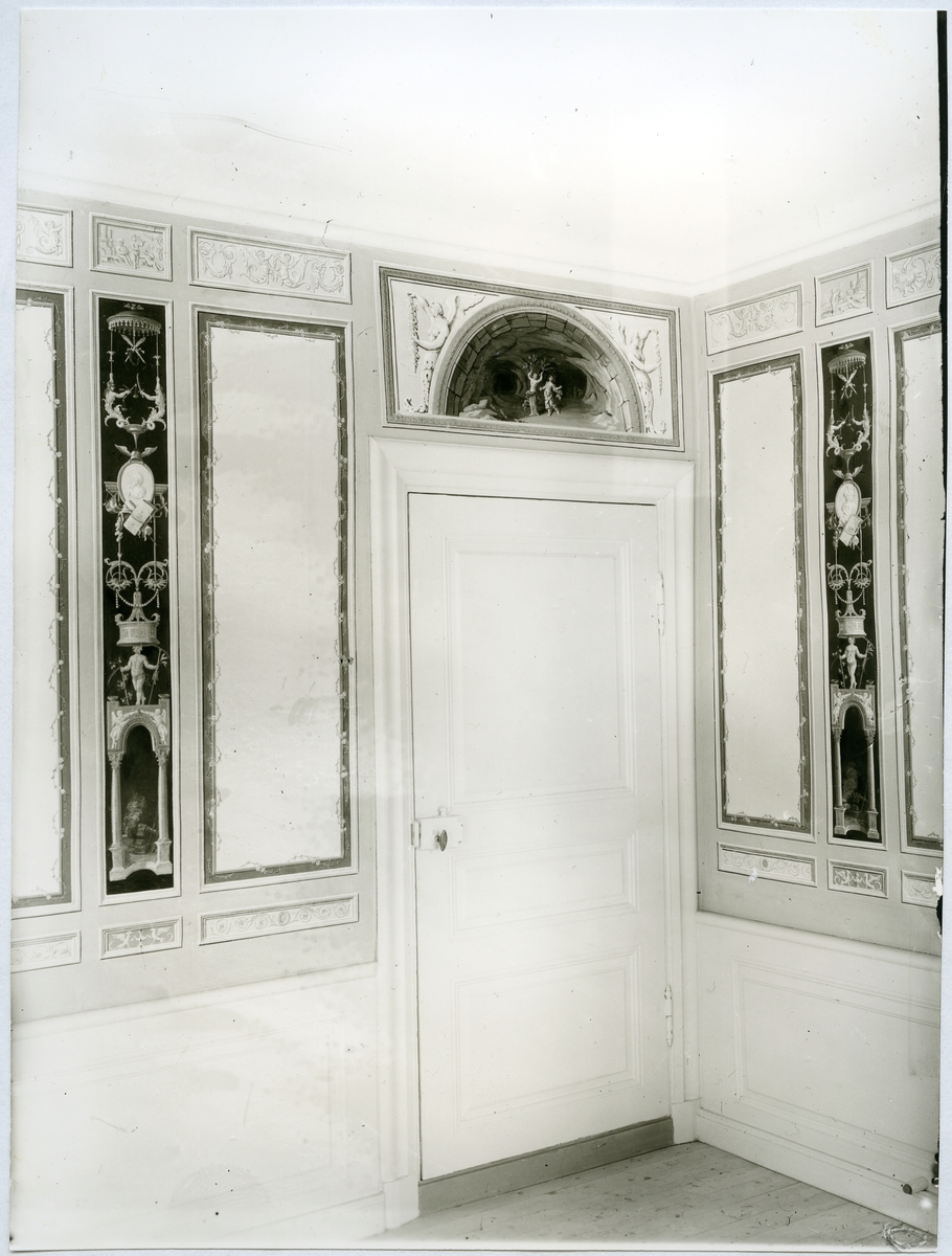 Interiör med bemålad tapet i dörröverstycke och väggfält. 1973.