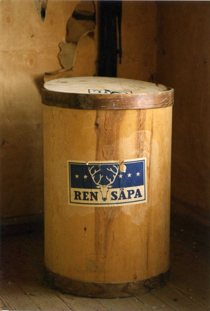 Titel: Kolbäck sn, Hässelby. Tunna - rund träbehållare med etikett där det står: REN SÅPA.