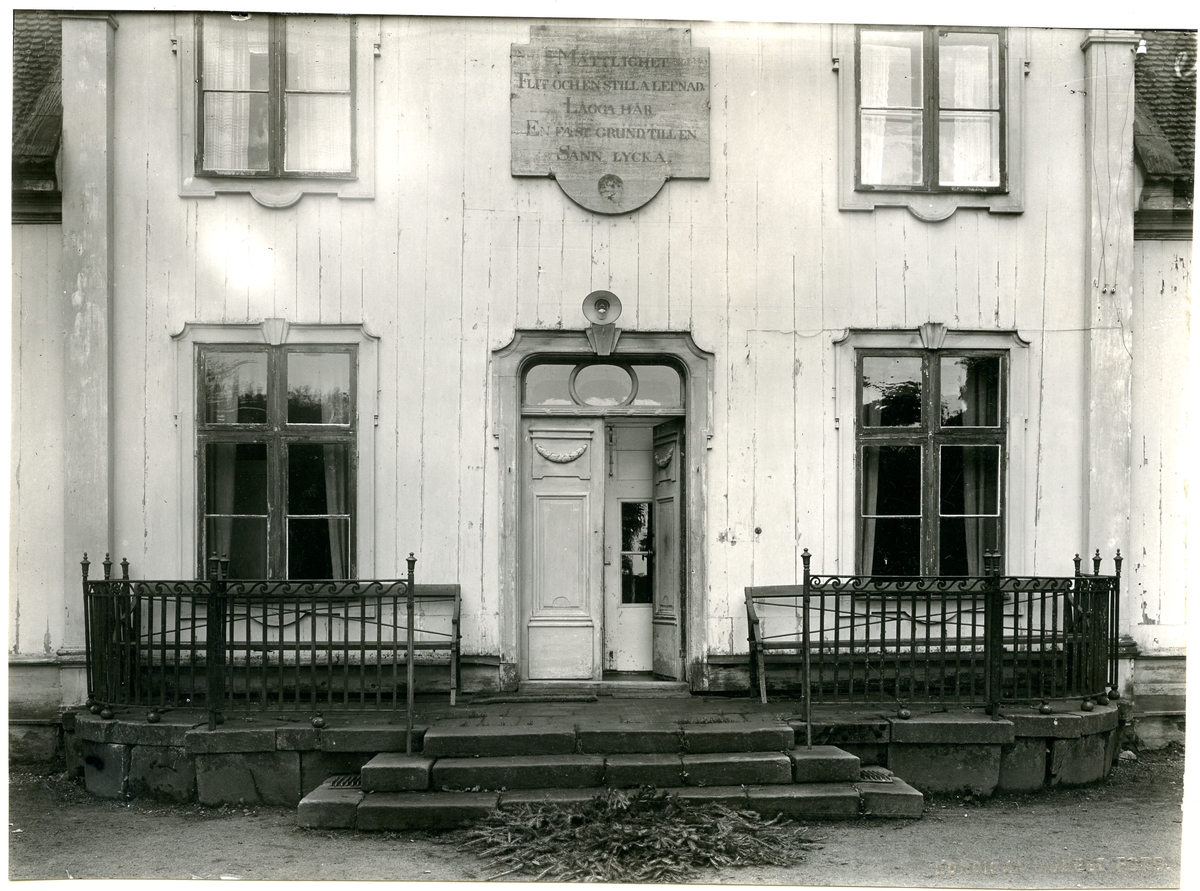 Lindö herrgård.Entrésidan med skylt ovanför dörren, med texten: