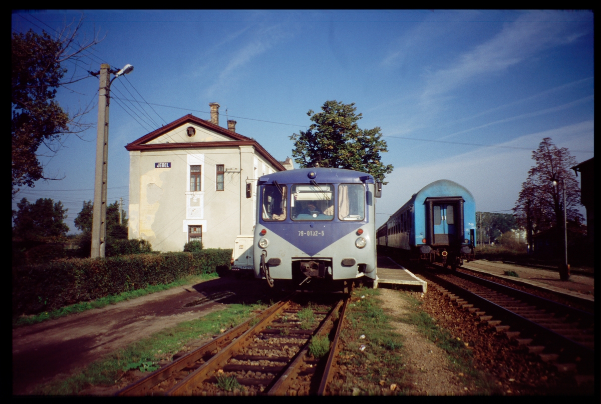 Motorvagn och personvagn vid Jebel station, Rumänien.