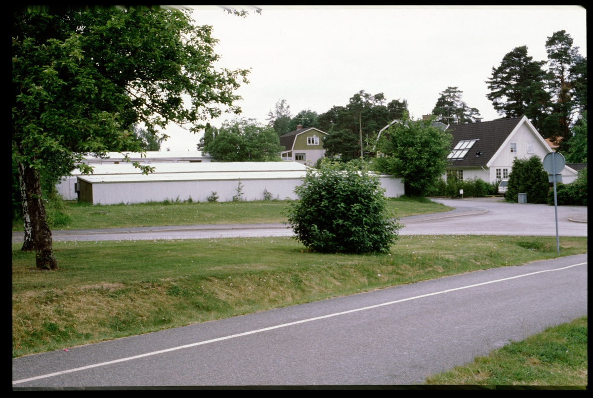 Bostadshus och garage i Strängnäs. Bilden märkt med Dompens garageförening.
