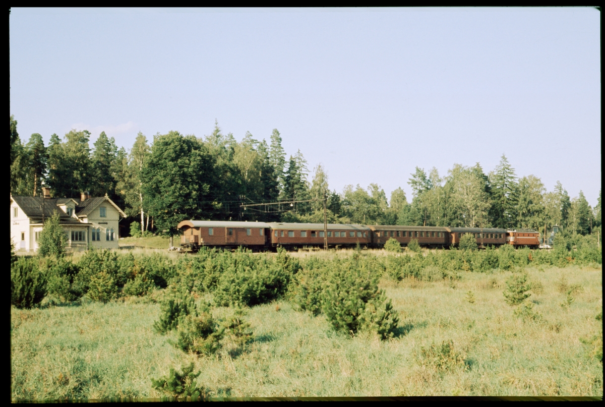 Trafikaktiebolaget GrängesbergOxelösunds Järnvägar, TGOJ Bt med personvagnar vid Byringe station.