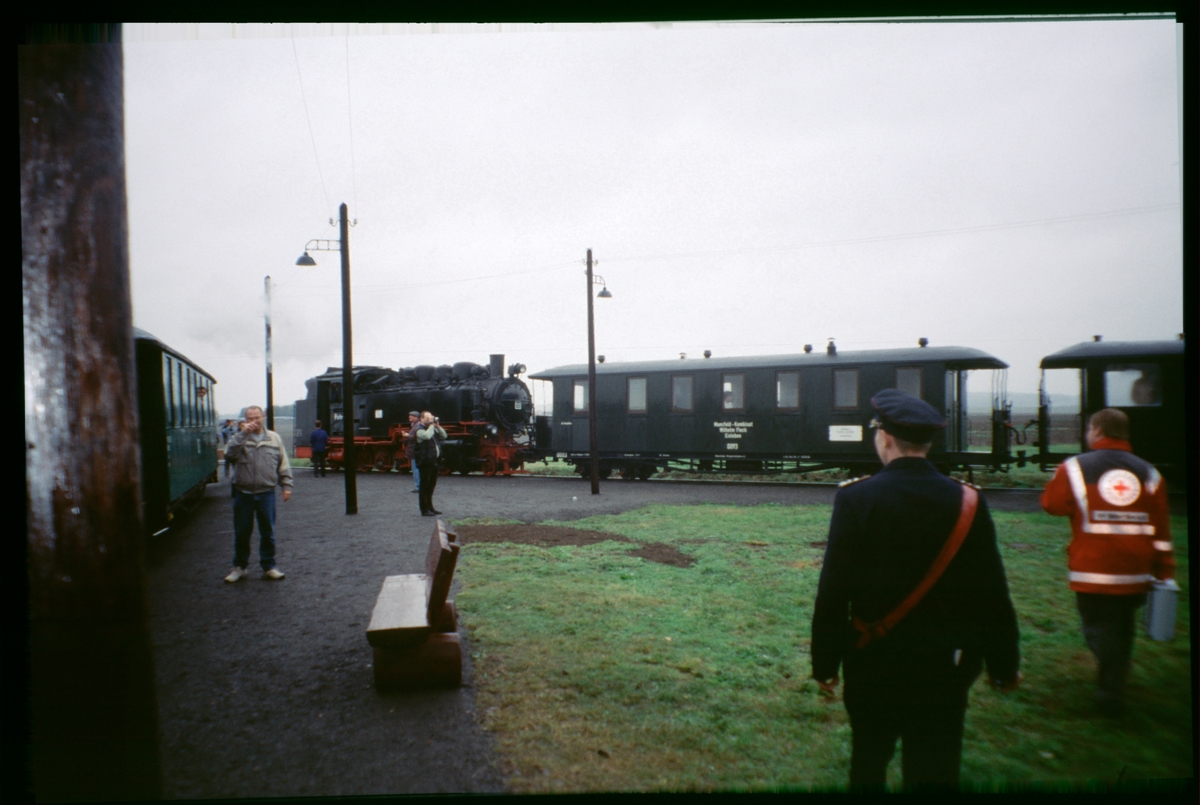 Ånglok och personvagnar vid anhalt på sträckan mellan Klostermnsfeld och Siersleben.