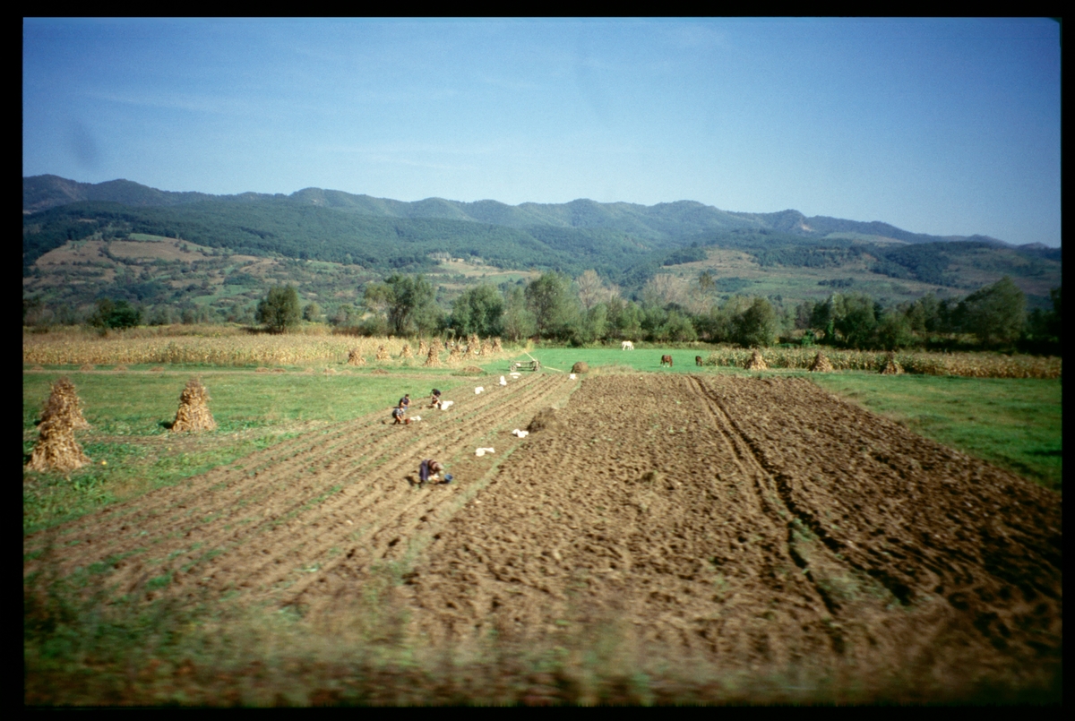 Potatisplockning sett från tågfönster på sträckan mellan Simeria och Pui, Rumänien.