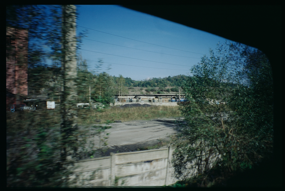Vy från tågfönster vid Coroieti, Rumänien. På håll syns ett flertal avställda industrilok.