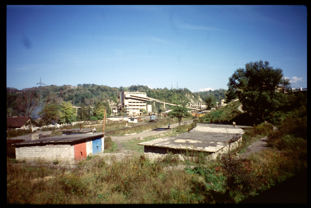 Vy från tågfönster vid Coroieti, Rumänien. Industrilok i drift.
