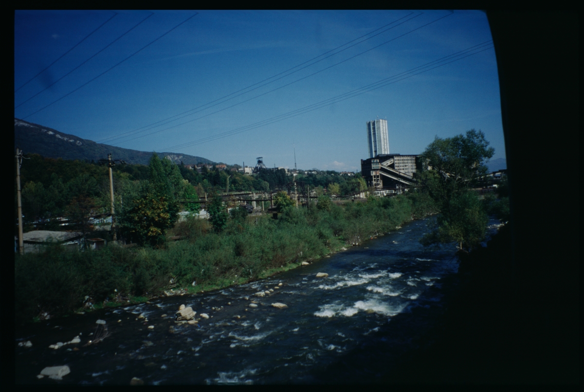 Vy från tågfönster över industriomårde i Lupeni, Rumänien.