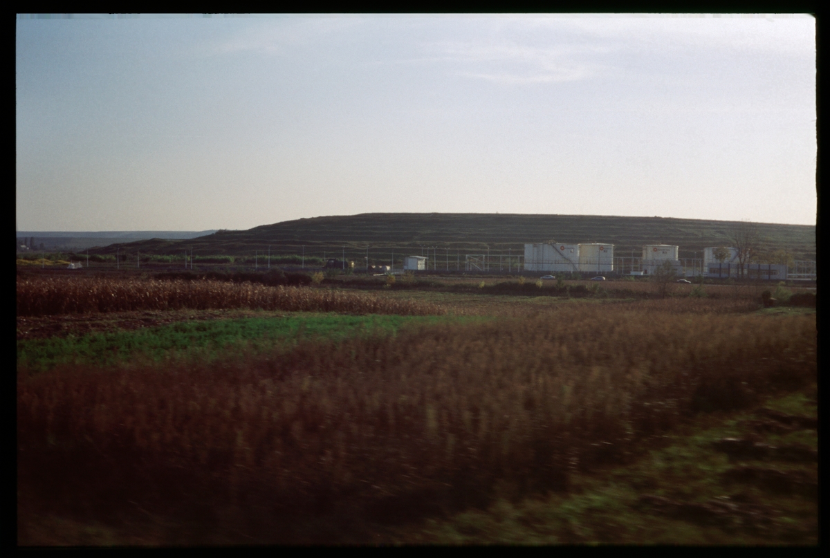 Vy från tågfönster över oljedpåer i Brbteti, Rumänien.