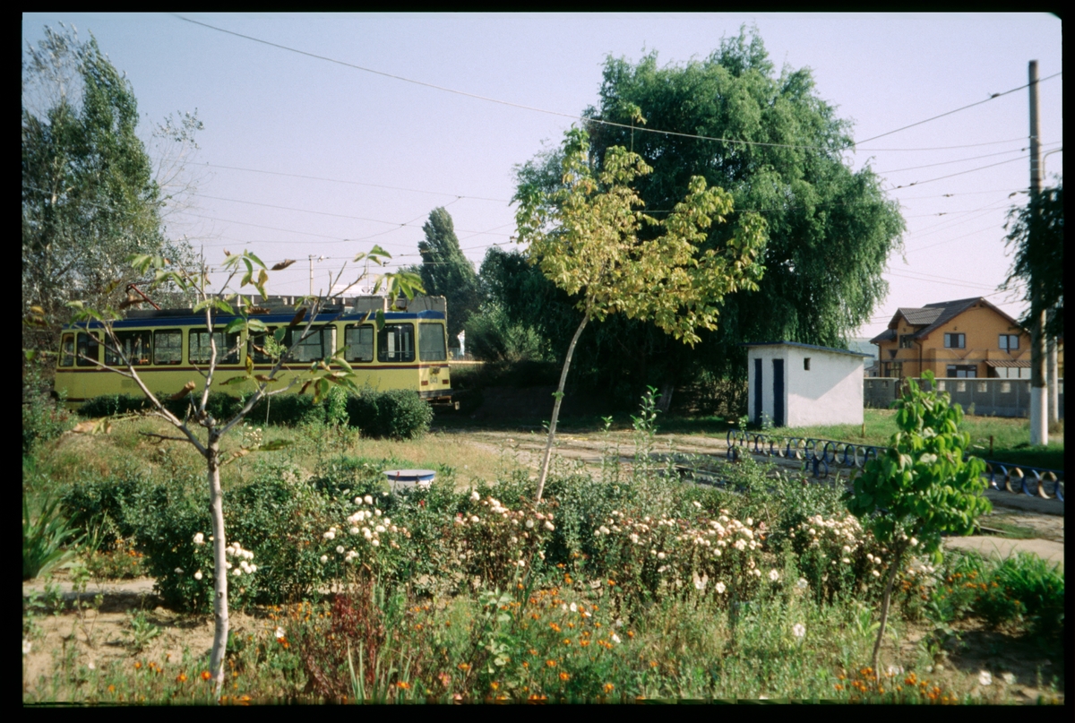 Spårvagn vid stationen vid Daewoo bilfabrik i Craiova, Rumänien. Avträde syns till höger i bild.