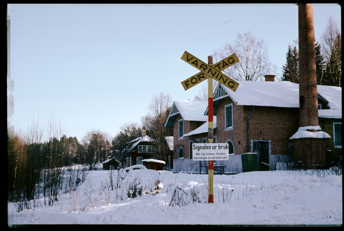 Skylt vid Dunker station med texten: "Signalen ur bruk När tåg kommer bevakas korsningen av särskild vakt".