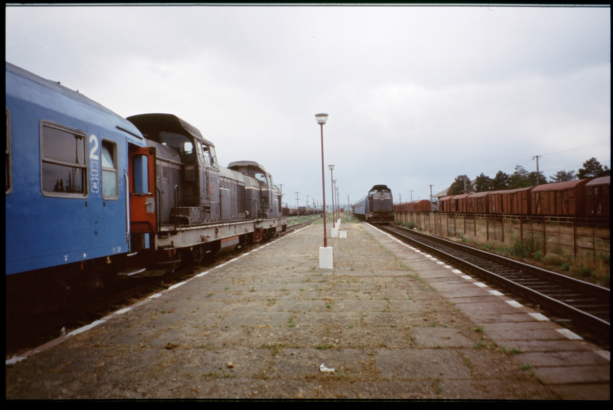 Tågmöte vid station i Rumänien, möjligen vid Babeni station.