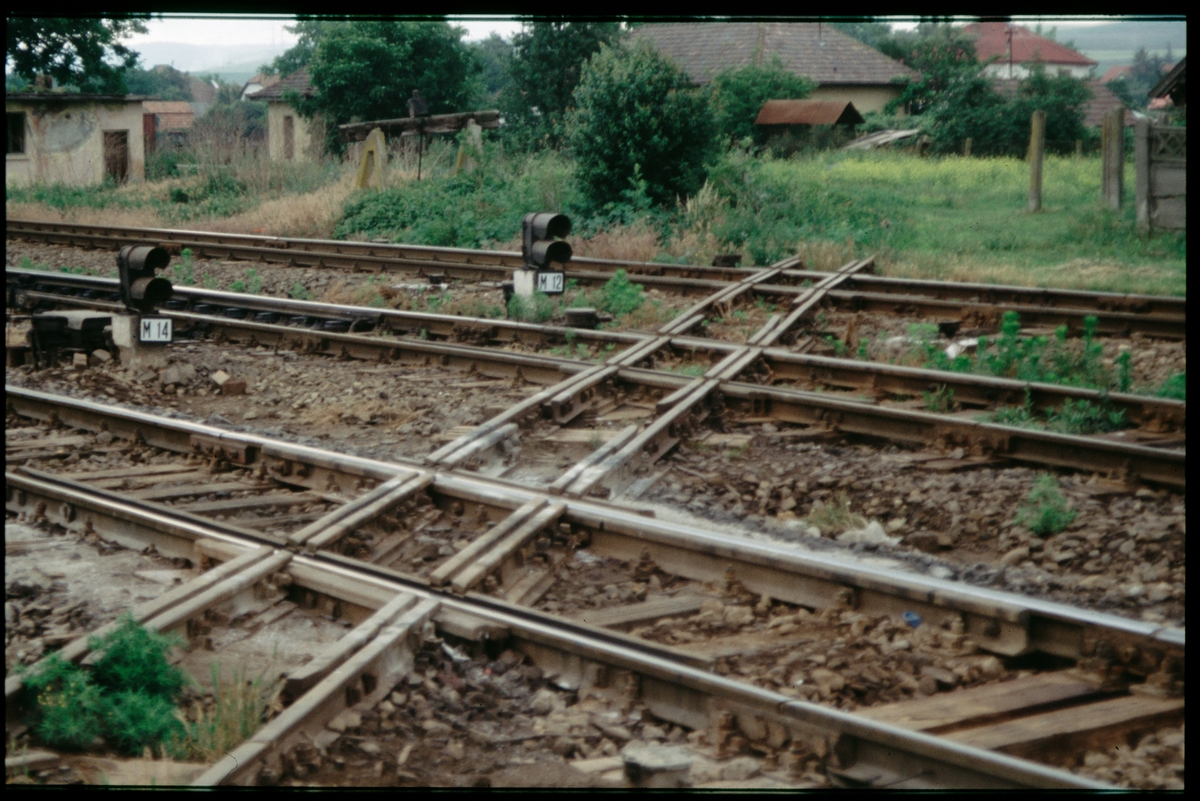 Korsning mellan 760 mm och 1435 mm spår, på bangården vid Tirgu Mure Sud station, Rumänien.