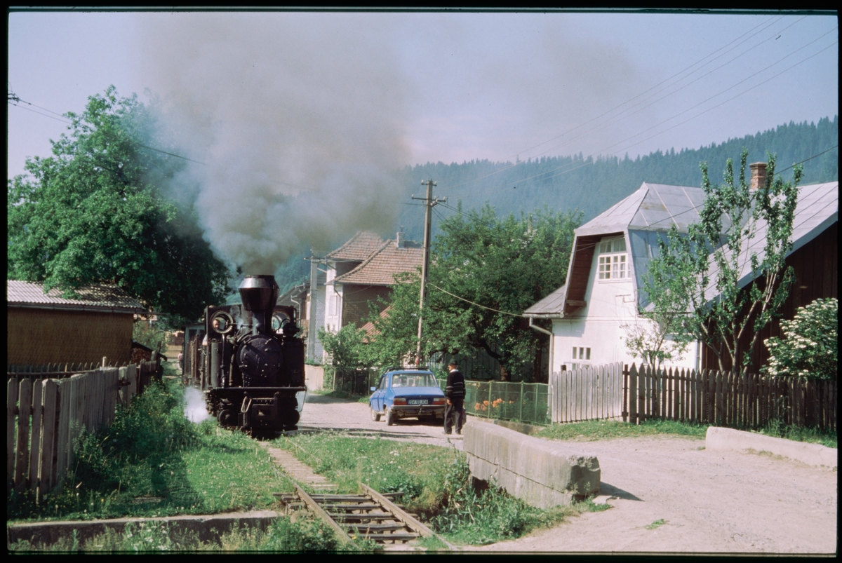 Ånglok med vagnar strax utanför bangården i Moldovia, Rumänien.