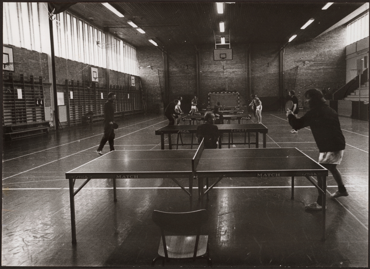 Flera pingismatcher spelas samtidigt i en gymnastiksal. Järnvägens idrottsförening.
