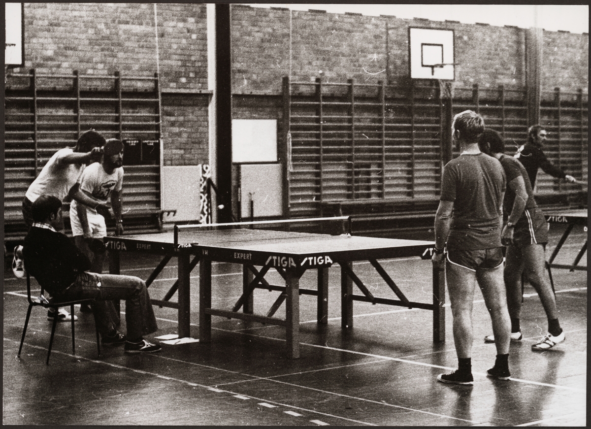 Dubbelmatch i bordtennis spelas i en gymnastiksal. Järnvägens idrottsförening.