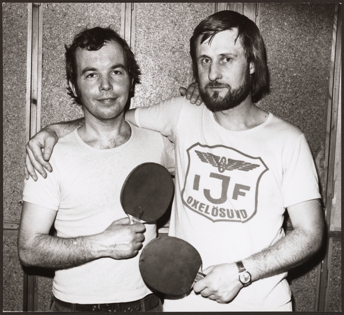 Från vänster Willis Nordhäger, Eskilstuna och Jan-Erik Johansson, Oxelösund. Finalister i motionsklassen i en bordtennisturnering. Järnvägens idrottsförening.