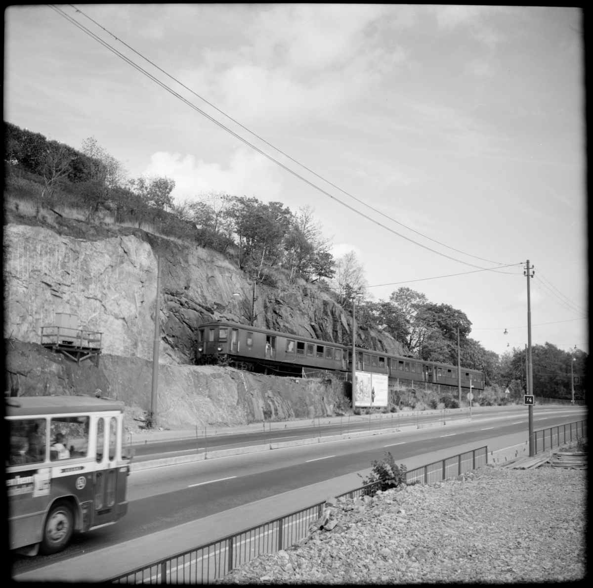 Persontåg på linjen mellan Stadsgårdens station och Fåfängan, Saltsjöbanan. Uppe till vänster i bild syns Fåfängan.