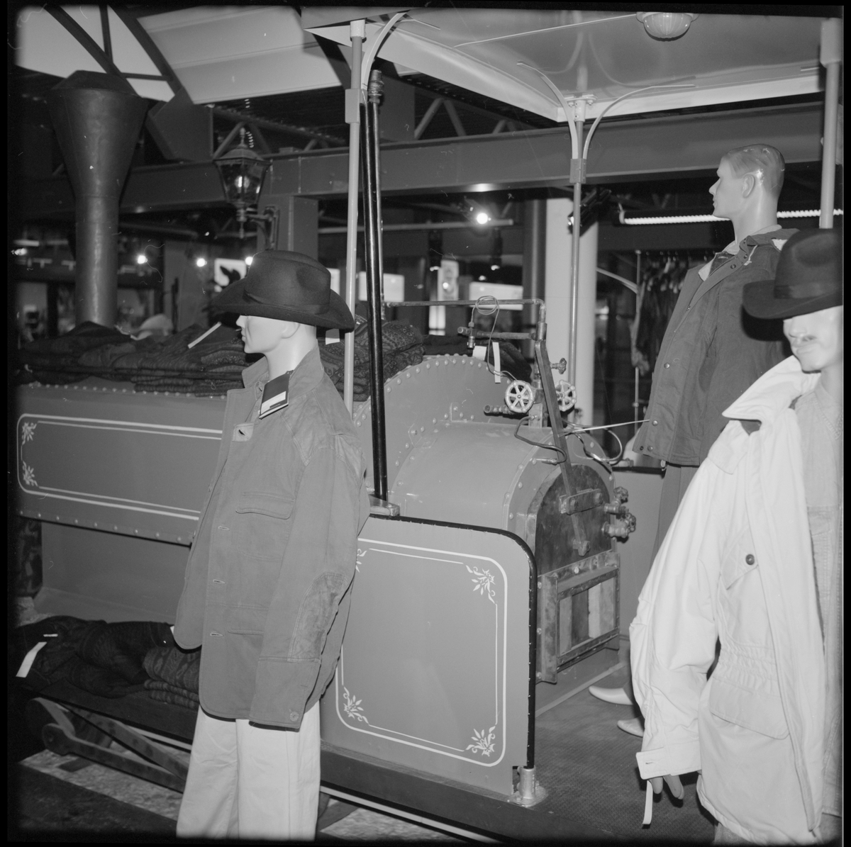 Troligen Trafikaktiebolaget Grängesberg Oxelösunds Järnvägar, TGOJ ångloksmodell i Scania-Vabis klädbutik.
