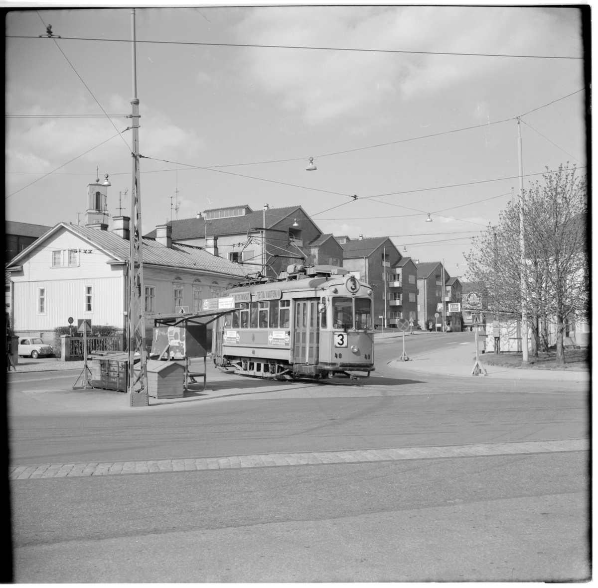 Turun Kaupungin Liikennelaitos, TuKL 40 "gasmasksvagn" linje 3 från Martinsgatan, svänger in på Stålarmsgatan.