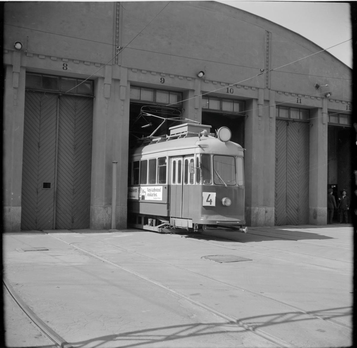Helsingin Kaupupungin Liikennelaitos, HKL spårvagn linje 4 utanför vagnhallen i Vallgård.