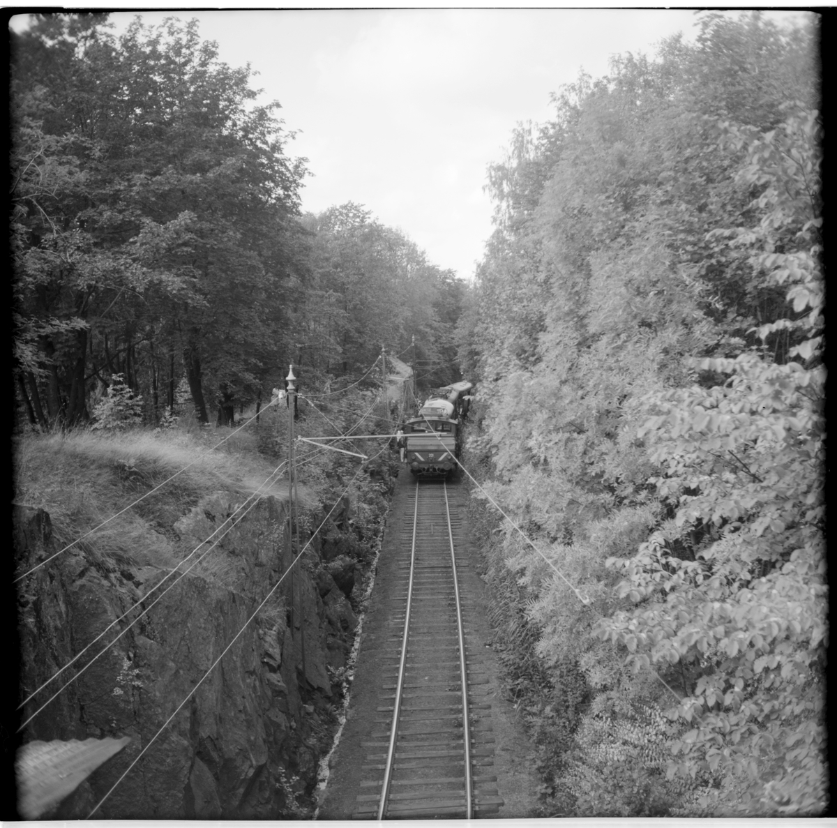 Trafik Aktiebolget Stockholm Södra Lidingöns Järnväg, SSLidJ lok 201 bärjar i Herserudsbacken efter påkörning.