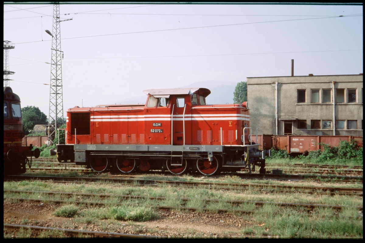 Diesellok på bangården i Septemvri, Bulgarien. Dieselloket har nummer 52 073.4 och loket som skymtar till vänster har nummer 45 185.6.