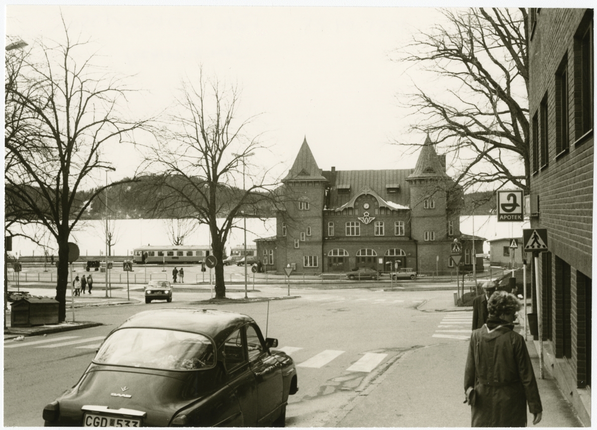 Ulricehamn stationshus, från gatusidan. I förgrunden syns en Saab V4. På spåret står ett motorvagnståg.