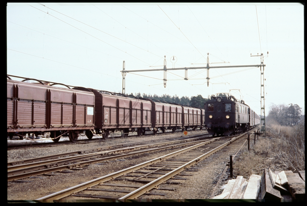 Ellok och godsvagnar på bangården vid Åkers Styckebruk.
