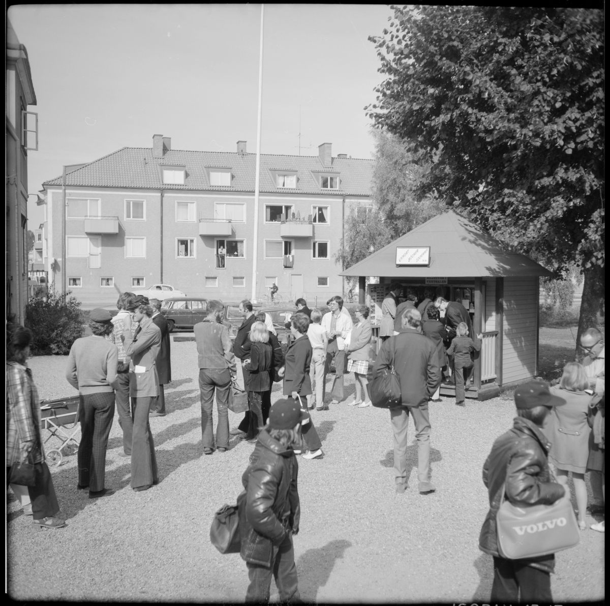 Besökare till Museijärnvägen, Östra Södermanlands Järnväg, ÖSlJ vid kiosken utanför stationshuset i Mariefred.