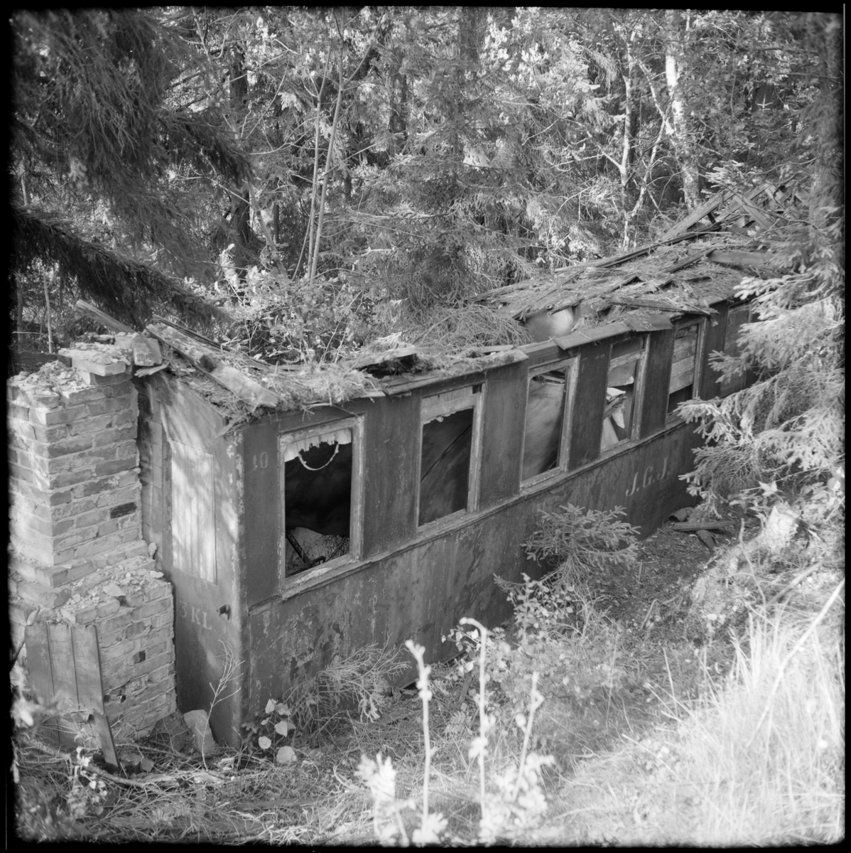 Växande gran och lövträd i Jönköping - Gripenbergs Järnväg, JGJ personvagn 10.