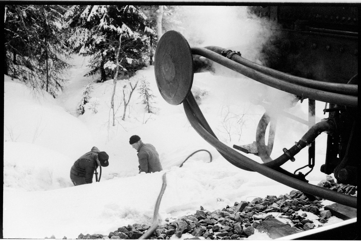 Igenfrusna trummor upptinas med ånga från ånglok.