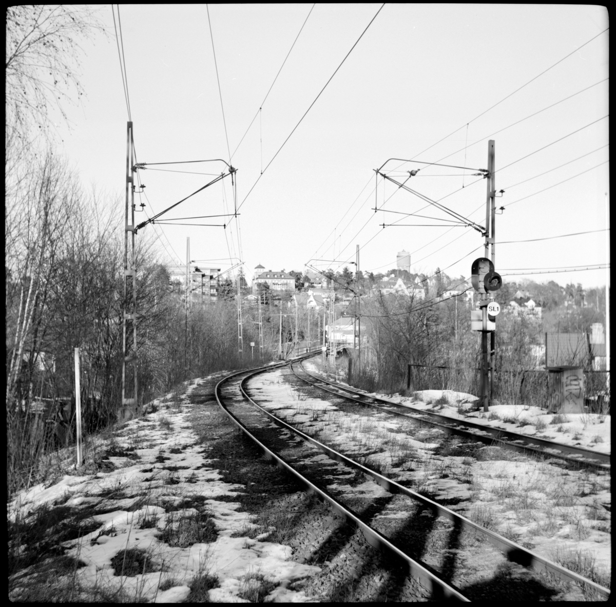 På linjen mellan Freskati och Stocksund efter Roslagsbanan. Längre fram ser vi järnvägsbron över Stocksundet.