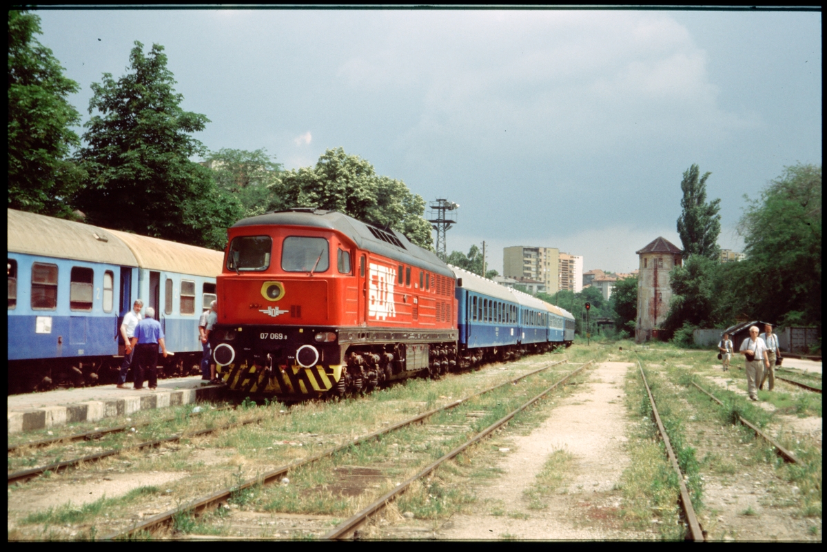 Uppehåll med utflyktståg i Bulgarien. Loket har nummer 07 069.8.